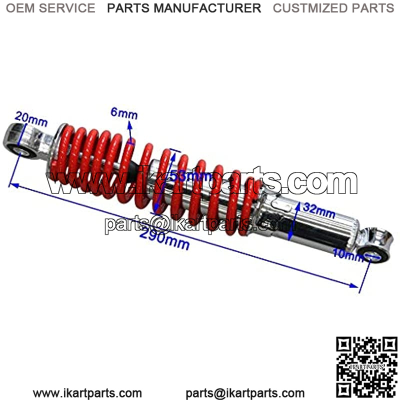 Specification:Travel length: 50mm (1.97″)Eye center to center: 290mm (11.4inch)Mounting hole diameter: 10mmMax loaded of each shock: 400lbsPackage includ : 2 x shocks