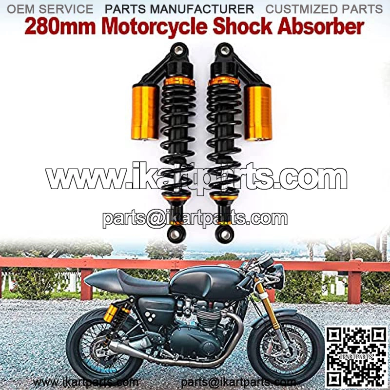 High-performance shock absorber: The suspension provides smoother driving and better overall damping management, improving driving comfort, motorcycle handling and driving safetyProduct fitment: general-purpose air shock absorber, suitable for most 90cc 150cc-750cc street cars, Karting (karting), scooters and Moped Quad (ATV), with a force of 280mm. A great choice for upgrading your motorcycles and off-road vehicles.Product material: CNC aluminum alloy + high-strength steel, high-performance spring. Steel anti-corrosion, waterproof, anti-rust, personalized appearance (Black +Gold)Product parameters: Total length: 315 mm (12 3/8 inches). Eye diameter (with sleeve): 12 mm. Maximum eye tensile strength: 2,000 kgf. Spring stiffness: 110 kg. Maximum load: 330 lbs/150KgAdjustable strength: You can adjust the strength that suits you best, to deal with different road conditions.Easy to install,before placing an order, please make sure the size fits your bike.Why choose If you have “10,00