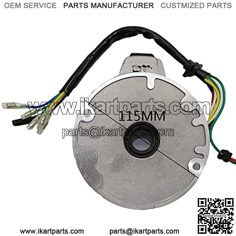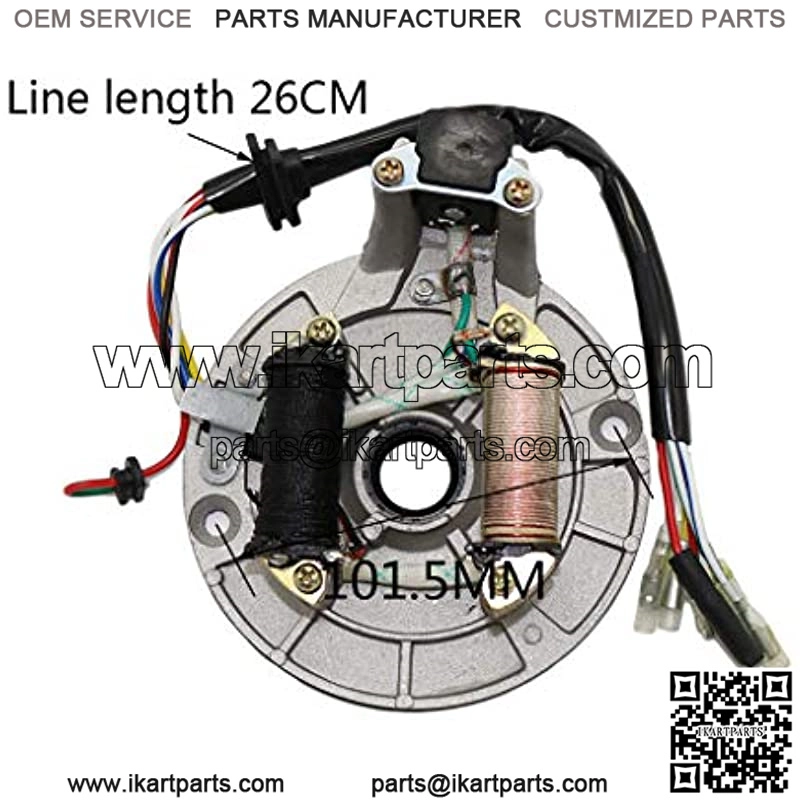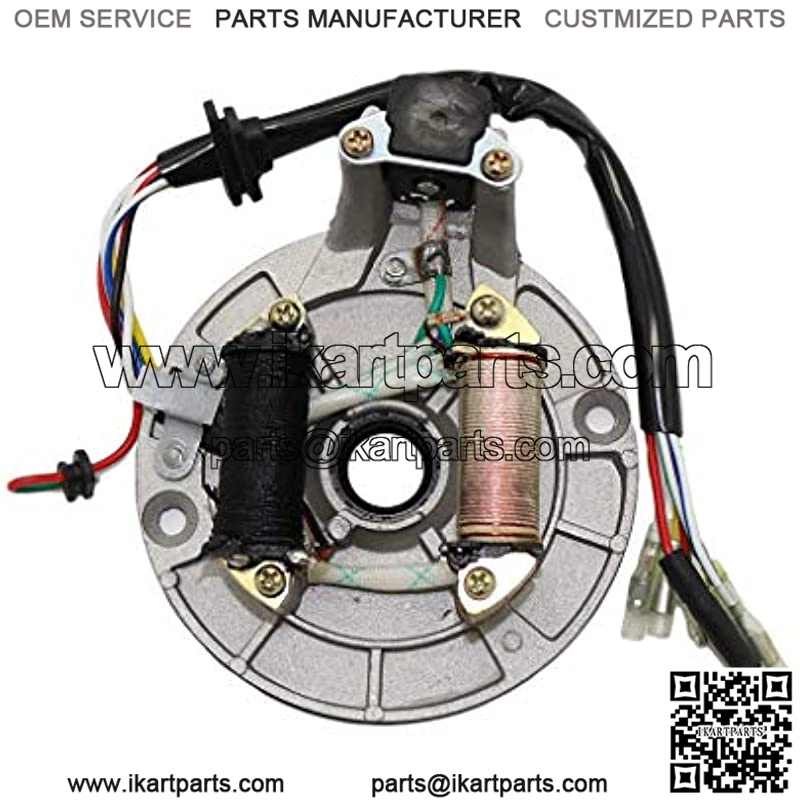 2-coil Magneto stator plate Compatible with 50cc 70cc 90cc 110cc 125cc dirt bike pit bike atv quad go kart ATVs and quads. Compatible with most of the brands from China such Comes with 2 coil and 6 wires(red,yellow,white,blue/white,red/green,white/green)(including 1 removable free wire) Full copper coil, Enameled wire full copper, Aluminum plate disc, High density material to prevent damage Pleaee note: This one not fit electric start model. Please choose the matching model to purchase when you purchase, I wish you a happy shopping.