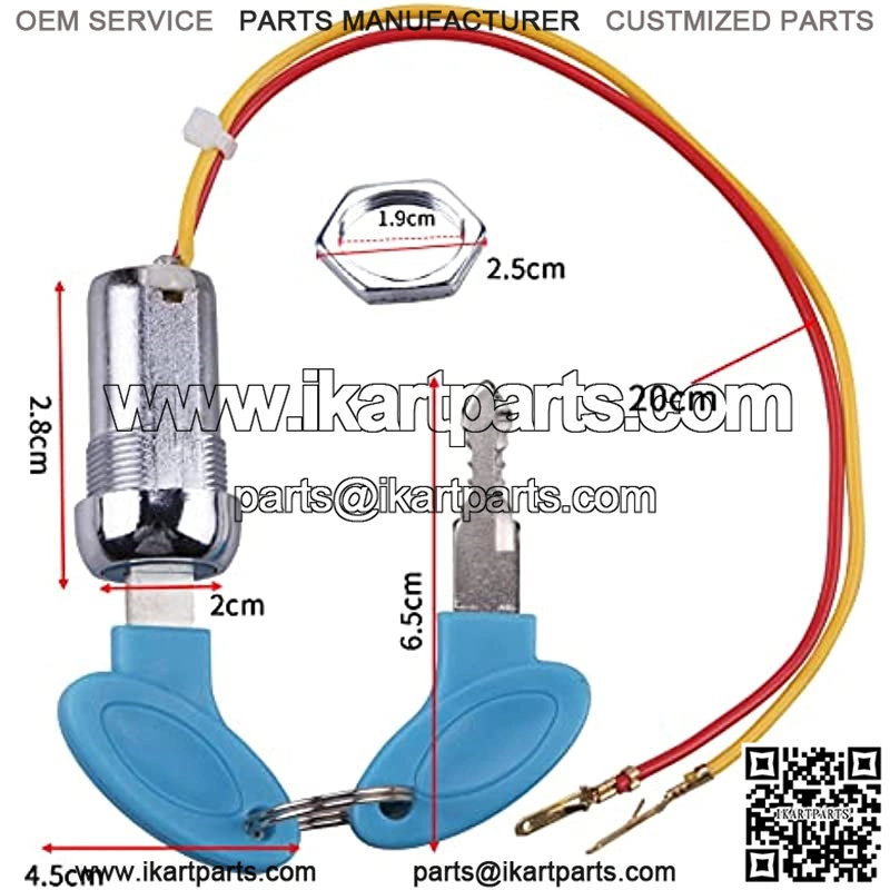 Ignition key Switch compatible with Electric Scooters, Electric bicycle, Gas lever lock, ATV, Moped, Go kartLock diameter: 20mm; Line length:200mm; Key size:65x45mmDesigned with a reliable ignition switch locking mechanismHIGH QUALITY METAL ALLOY:This Ignition Starter Switch is made of metal alloy material,solid to usepackage: 2x Ignition Switch + 4x key