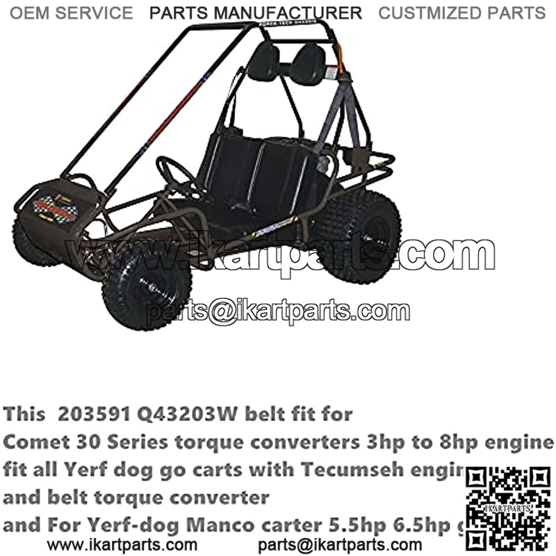 Features:quality aramid fiber reinforced and CR rubber oil and heat resistant,Excellent flexibility and resistance to lateral pressure,smooth transmission,excellent flex, long service life. 203591-Q430203W belt for Yerf-dog go-karts with Tecumseh engines and belt driven torque-converters.