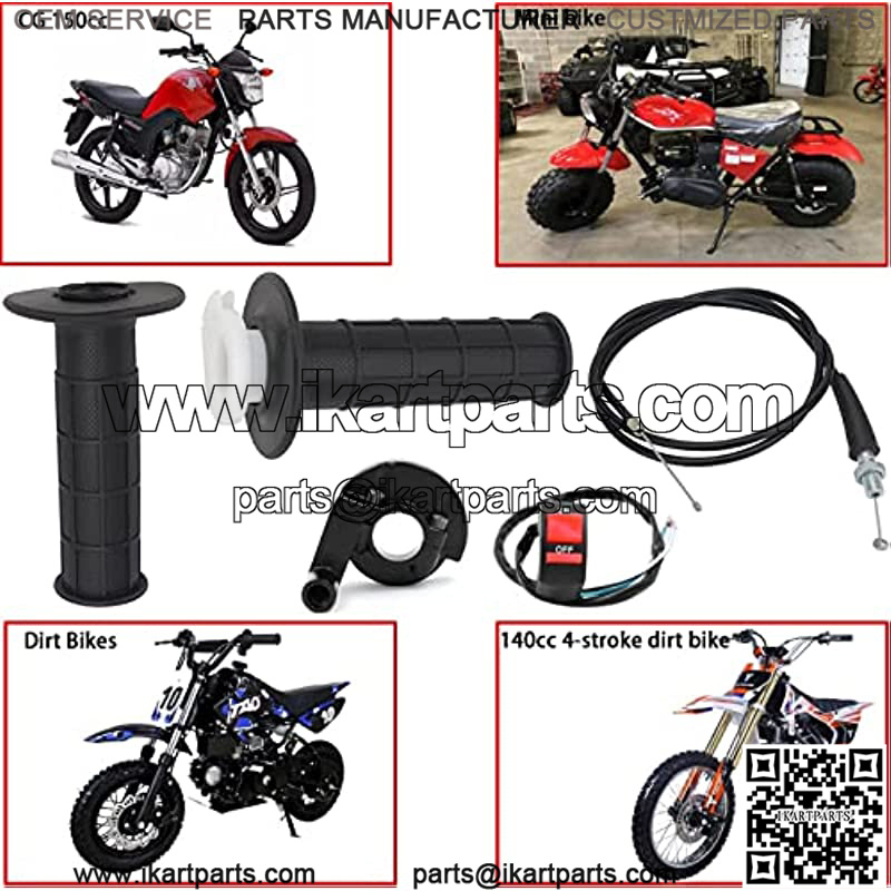 Throttle Handle Grips and Cable Fits for 7/8″ ( 22mm) ATV/ATC/Bike bar dirt bike.Throttle Accelerator Handle Grips and Cable Set for 50-1000cc dirt bike atv chopper.Throttle Handle Grips and Cable compatible with most of 50cc, 80cc, 90cc, 110cc 125cc 140cc 150cc 200cc & 250cc 4-stroke dirt bike, mini bike, pocket bike.Throttle Handle Grips and Cable fits mini baja mb165 196cc 5.5hp.Throttle Handle Grips and Cable fits mini baja mb200 200cc 6.5hp.Throttle Handlebar Assistant,Scooter Throttle Cable,SSR 125 Throttle Cable,Throttle Cable Kit,PW50 Throttle Cable,7/8 Throttle Assembly,Kawasaki Throttle cable,110 throttle cable,Twist Throttle Accelerator Handle Set,Throttle Clamp Assembly,PW80 Throttle cable,Throttle assembly works with: Baja DoodleBugBaja Mini Baja Baja BlitzBaja Racer