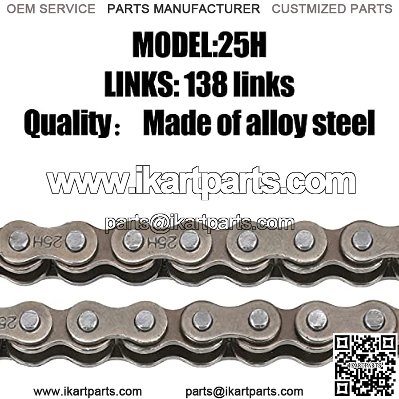 Package includes: 1 x 25H 138 Links Chain. 15 x 25H master links.ium Quality: made of alloy steel, heavy duty and long durabiltiy.