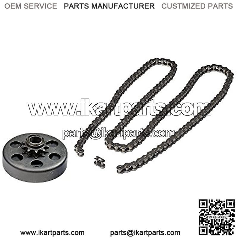 When you need a replacement clutch assembly with 3/4″ shaft and 10 tooth 420 chain sprocket, our clutch assembly set with a chain sprocket and five feet of #420 open loop chain is an excellent choice for go-karts and mini bikes, especially for the DIY garage mechanic. Our clutch is the same style used on many offroad vehicles from Baja, Coleman, Manco, and many others. The clutch features a 3/4″ shaft bore and is topped off with a pre-installed 10 tooth sprocket made for use with #420 chain. The #420 size chain can be found on go-karts, dirt bikes, dune buggies, as well as some ATVs or other applications that typically run on 49cc, 50cc, 70cc, 110cc, or 125cc engines. We include five feet of open loop chain together with a master link. You can cut the chain to your desired length for a perfect fit. Please note that you will need to cut or otherwise shorten the chain yourself if the chain is too long for your needs. All in all, our clutch, sprocket, and chain combination set is an outstanding value.Clutch bore (shaft) diameter: 3/4″Sprocket tooth count: 10Chain size: #420Chain length: 5’Pitch: 1/2″Roller Diameter: 5/16″Roller Width: 1/4″Combined weight: 4.35 lbs.
