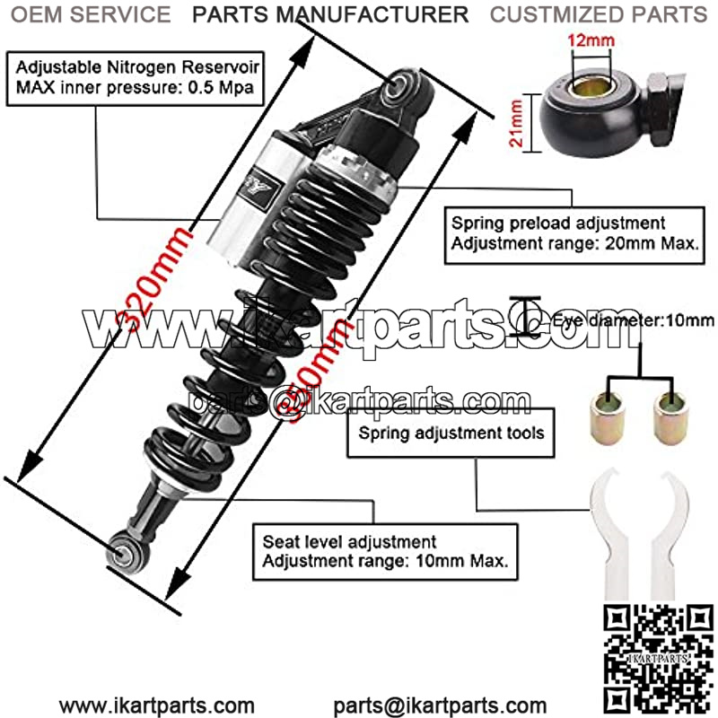 Condition: Brand new/Never used GZYF 320mm 12.59″ A Pair Rear Nitrogen Shock Absorbers Fit Kawasaki Black & Silver Color: As picture show Material: Solid Steel+Aluminium Alloy Installation Type: Eye to Eye Fitment: Universal Fit. Work perfectly on most 150cc~750cc street bikes, Karting(Go kart), Scooters and Moped Quad (ATV) with shocks of 320mm eye to eye distance. Great choice for replacement, style upgrading and all kinof bike modification. Dimension: Total Length: 350mm (13 3/4″) Length of Eye to Eye Core: 320mm (12 5/8″) Eye Diameter(with bushing): 12mm Eye Diameter(with bushing removed): 16mm Eye Thickness: 21mm Eye Maximum Tensile Strength: 2,000 Kgf Spring Thickness: 7mm Spring Width: 60mm Working Stroke: 60mm Spring Stiffness: 110 kg Maximum load: 200 kg ( 440 lbs) Air Reservoir: Adjustable Factory Air Pressure: 0.4 Mpa Maximum Air Pressure: 0.5 Mpa *No fitting manual included. Recommend qualified mechanic fits or checks after the fitting of this product. Package included: One pair shock absorbers Other size for shocks for your reference: 320mm(from eye to eye distance): http://www.amazon.com/dp/B015ZJRE22 340mm(from eye to eye distance): http://www.amazon.com/dp/B015ZKFCPW 375mm(from eye to eye distance): http://www.amazon.com/dp/B015ZIXDG4 400mm(from eye to eye distance): http://www.amazon.com/dp/B015ZHDD1U