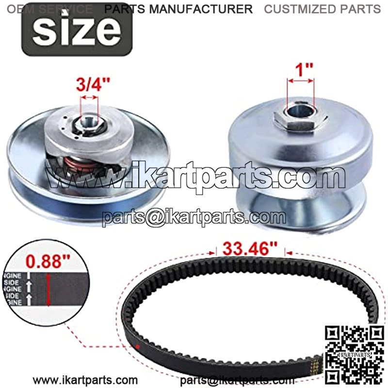 Package include 1X 1″ bore driver clutch pulley, 1X 3/4″ bore driven clutch pulley, 1X 203785 Belt??Length: 33.46”/850mm, Width: 0.88″/22.3mm)??.