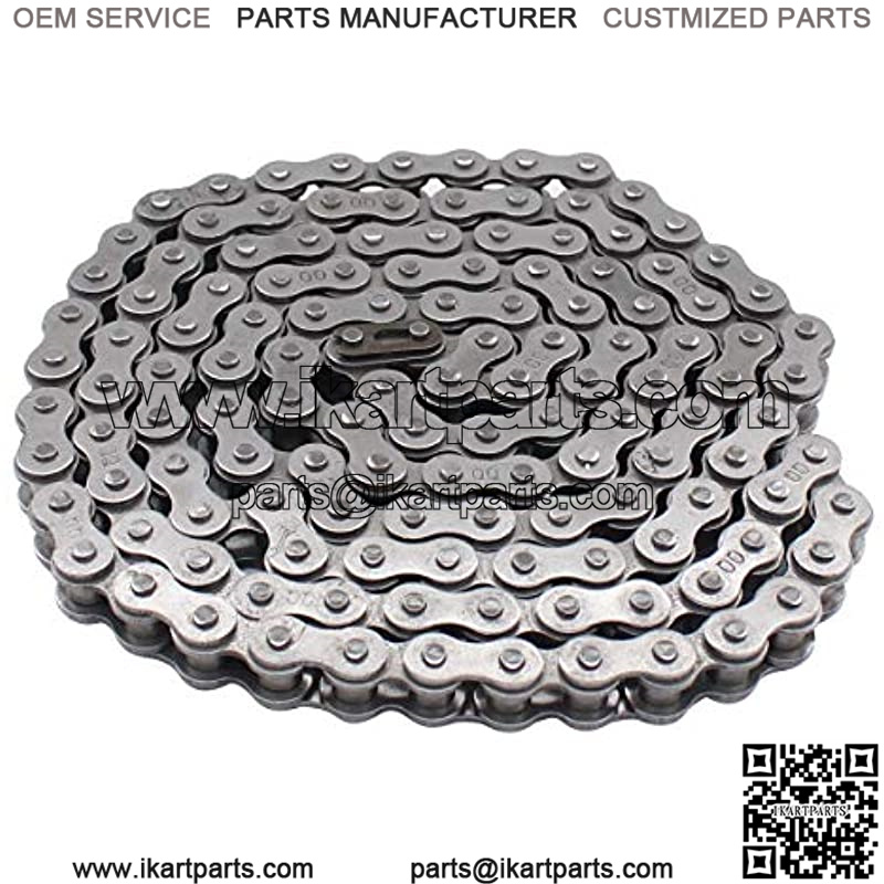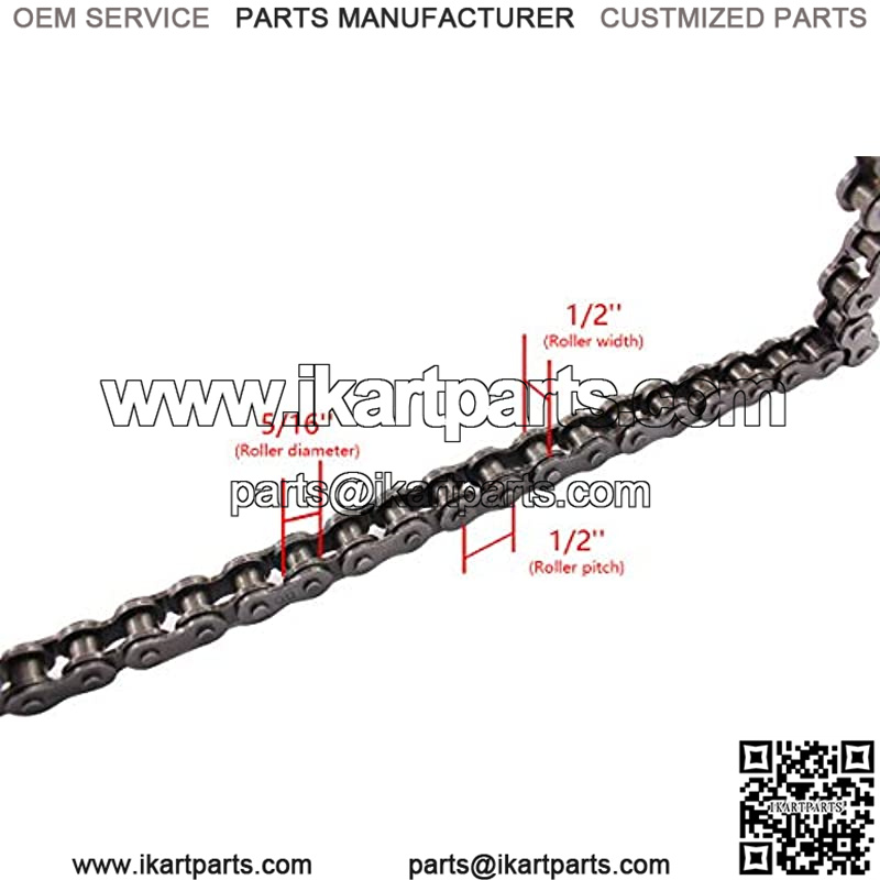 Chain number: 420; Links:132; Pitch: 1/2″; Roller Width: 1/4″; Roller Diameter: 5/16″; Sprocket Thickness: 0.227″. Breaker suitable for 420-530