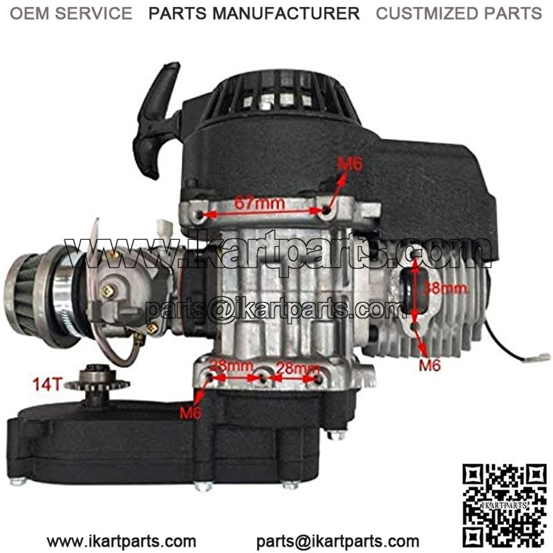 Specifications:Engine Type: 1-cylinder, air-cooled, 2-stroke Displacement: 49cc Chain Size: T8FMax output/Rotation(kw/rpm): 1.82/7000 Bore x stroke: 44x34mmFuel: Petrol and engine oil mixture(proportion 25:1) Ignition: C.D.I Lubrication: Mixed fuel oil Carburetor: Diaphragm typeFuel tank capacity: 1.2LStarter: RecoilAir filter: CommonPackage include: 1 x Engine + 1 x Exhaust Pipe