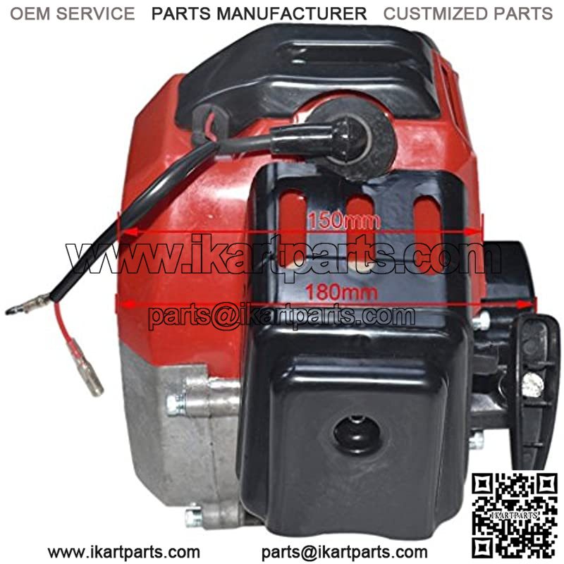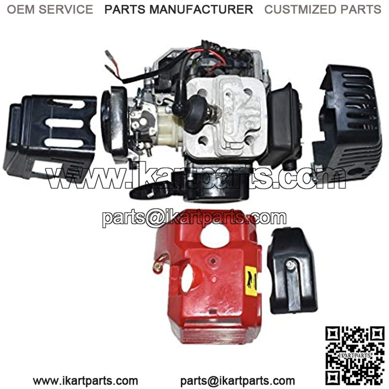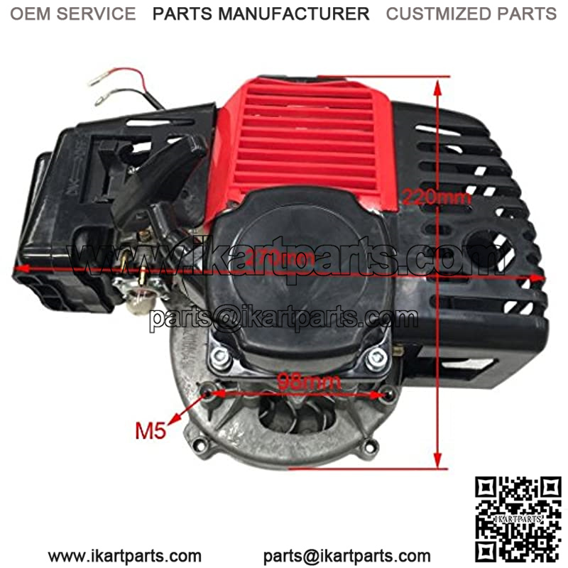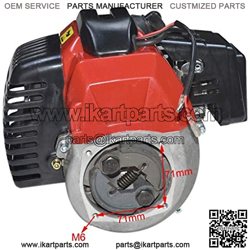 49cc single cylinder, air-cooled, 2-stroke Fuel: 25:1 gasoline / engine oil mixPiston Diameter: 44mmTop Mounting Brackets: 11cm Bottom Mounting Brackets: 10.3cm Top Through Hole Diameter M.B.: 0.161″ Bottom Through Hole Diameter M.B.: 0.245″ Exhaust Diameter: 0.589″ Connector: 2 Pin White Cord: 75cm Length: 26cm Width: 23cm Height: 20cm Clutch Mounting Hole Distance: 7.3cm Clutch Mounting Hole Diameter: 0.289″ Clutch Pad: 2 Shoe Carburetor Hole Diameter: 0.213″ Pull Start Mounting Hole Distance: 7.3cm Weight: 4.5KG
