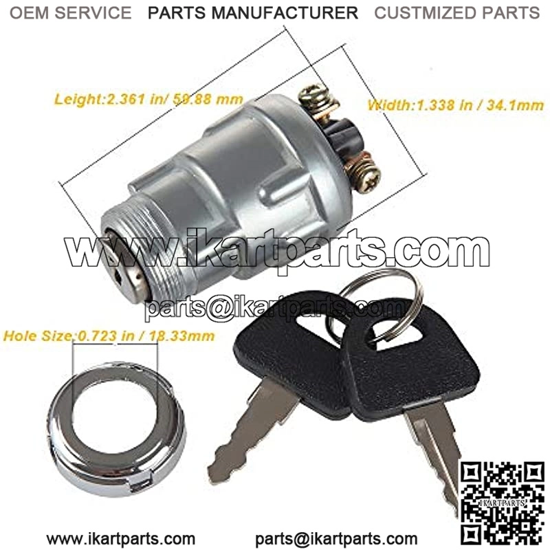 Universal 12V 10A Ignition Switch fit most 150 200 250 -500 vehicles, suck as car, motorcycle, tractor, forklift, truck, golf Kart, dune buggy, UTV,AVT, jeep and so onThree contact terminals to ensure Ignition efficiently. on the 3rd position, the switch will spring back to the 2nd position.3 Position (Off/Ignition/Start)Material: Zink alloy body of switch & 2 pcs of iron key & cooper connection terminals & Iron screw .Fits about 24mm round holeUniversally fit most vehicles, suck as car, motorcycle, tractor, forklift, truck, golf Kart, dune buggy, UTV,AVT, jeep and so onWe invite customers to participate in product testing, if the test results are not suitable for your equipment, please apply for a full refund. We provide 1 years?? warranty for all of our products since the purchasing day and accept return/replace with any reason. If the product is damaged due to shipping or installation,pls dont hesitate to contact with me , we will send you new for free.Product Description Product de