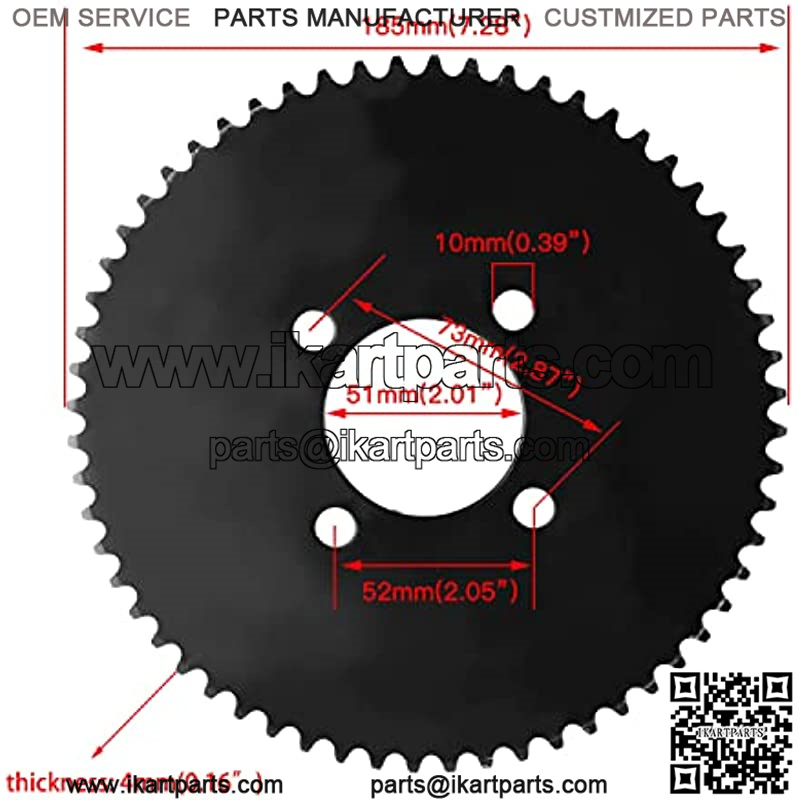 Size :#35 60 Tooth Rear Sprocket. Overall Diameter: 185mm (7.28 inch), Center Hole Diameter : 50.5mm (1.98 inch), Mounting Hole Diameter : 10mm (0.39 inch), Mounting Hole Distance (center to center, bolt hole circle): 51.5mm (2.02 inch).