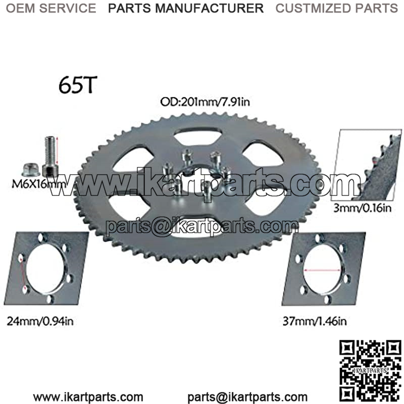 Centre to centre: 24mmTooth Number: 65 teethFit Shaft: 37mmMounted holes: 6 holes65T 37mm #35 Chain Rear Sprocket for Go Kart Mini Bike ATV Drift Trike