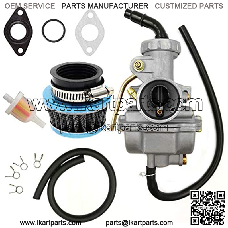 One carburetor replacement set include a manual choke valve pz20 carburetor, an air filter, a fuel filter, a fuel line, an air filter clamp ring, 4 fuel line clips and 3 gaskets