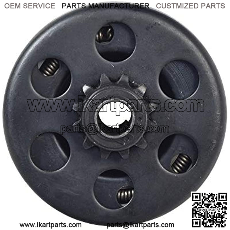 Our clutch assembly with 5/8 shaft bore and a 12-tooth #35 chain sprocket for Coleman CK100 & SK100 go-karts is a great clutch to use with the 2.8 Hp engines that are used on many powersports machines. Go-kart clutches are not very complex systems. Most ‘karts use these very simple but durable centrifugal clutch units to transfer power from the engine to the belt or drive chain. Replacement go-kart clutch parts and assemblies for go-kart engines are therefore neither complicated nor expensive. Specifications Shaft size: 5/8 Sprocket: 12-tooth Chain size: #35 Weight: 2.5 lbs. Diameter: 4-1/4
