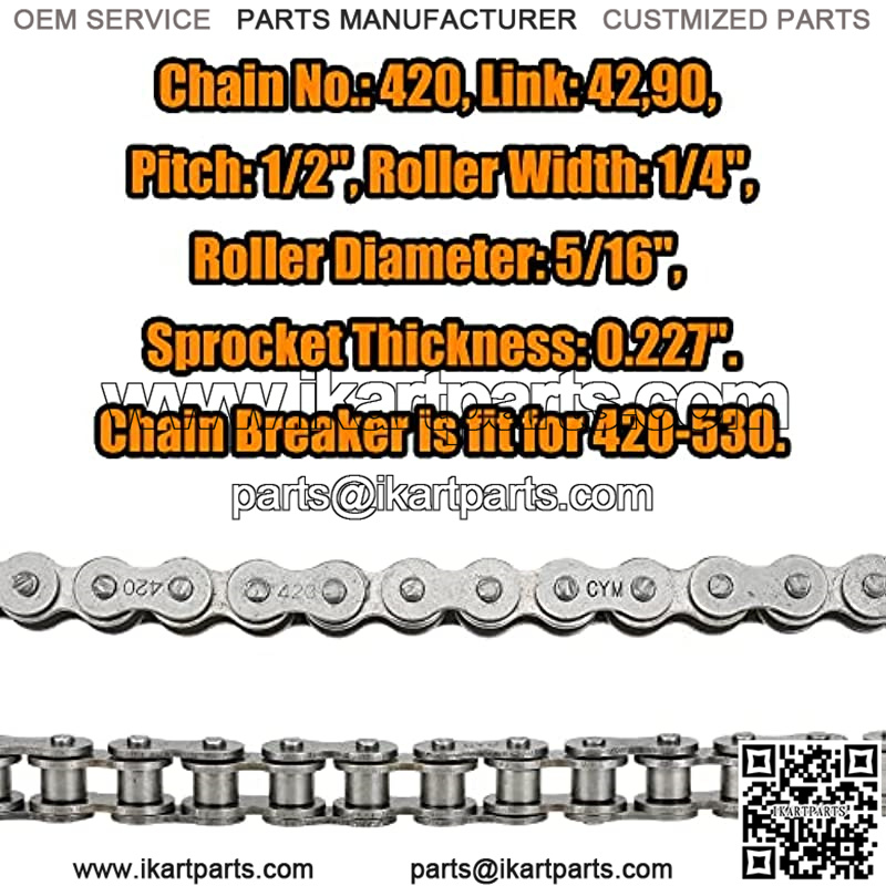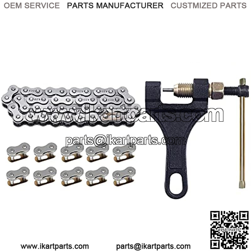 The standard 420 roller chains are made of alloy steel, high strength and good corrosion resistance , strong and durable. The chain breaker and chain links in the box make it easy to repalce the chain.