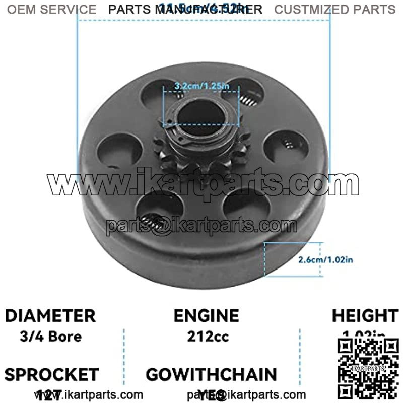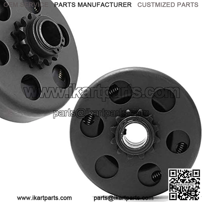 Go kart tractor mini bike centrifugal clutch 12 tooth, 3/4″ bore, use 35# chain. The clutch 3/4″ bore 12 tooth 35 chain fits Honda GX160, GX200, GX 140, GX120, GC160, GC190, for Harbor Freight Greyhound 196cc and Harbor Freight Predator 212cc Also fits any other engines with 3/4 crank shaft and 3/16?? key way, most 5.5 HP clones, 6.5 HP clones and 4-7HP motors. The Clutch also fits for 2 – 6.5 HP 168 188 gasoline engines for generator and go kart single wheel drive karts. Predator 2.8 HP 97cc engine with 3/4 inch output shaft with standard keyway. Centrifugal Clutch 3/4″ Bore #35 Chain 12T For Go Kart Mini Bike Engine 3/4 Bar Specifications: Material: IronClutch Bore: 3/4″Sprocket: 12 toothEngagement Speed: 2200??200 RPMFitment: Mini Bike, Go KartRecommended Engine: 2HP – 6.5HP, 3/4″ Shaft Fits: This Clutch Will Fit 2 – 6.5 HP Engines Honda GC160, GC190, GX120, GX140, GX160, GX200Also will fit Briggs & Stratton and 2 –