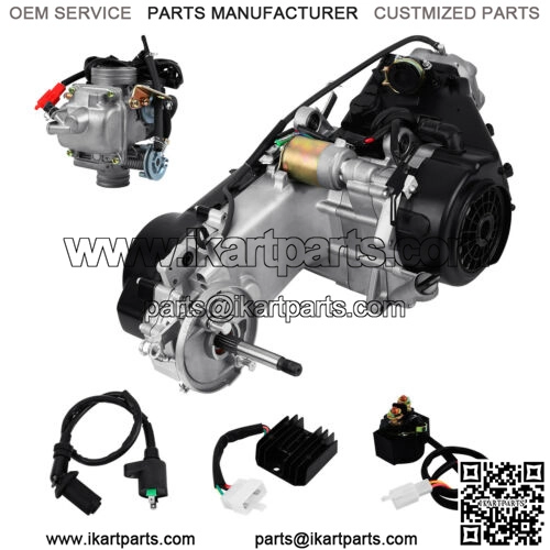 This complete engine includes carburetor, CDI, starter solenoid, coil, used in a wide variety of applications, including full-size street legal scooters, all terrain vehicles (ATVs), dirt bikes, and go karts, compatible with 150cc engine size scooters and vehicles.