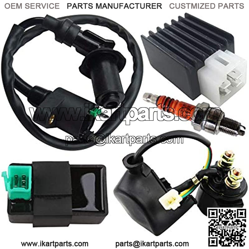 Package contain parts:Ignition Coil + 5 PINS CDI module + 4-pin Voltage Regulator Rectifier + Solenoid Relay + 3 electrode spark plug.The item fits for 50cc 70cc 90cc 110cc 125cc horizontal engine,not for GY6 or CG engine.
