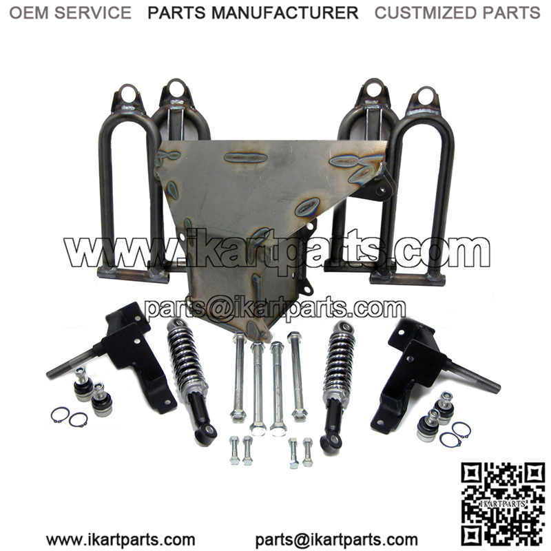 This is a front end assembly for the Spiderbox series go karts from . This complete front end was used on early Spiderbox models, that have a bronze bushing and sleeve in the a-arms. The center box is drilled to utilize a 1/2″ bolt.