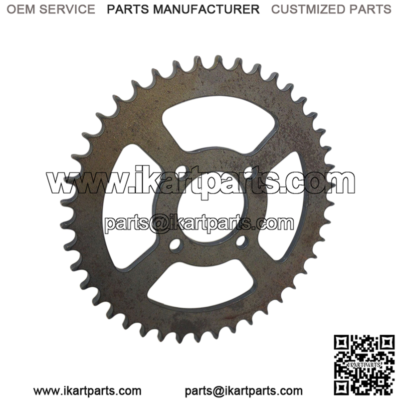 This 43T rear drive sprocket for a #520 chain has a (4) hole bolt pattern 3-1/8″ bolt circle. The center bore is 2.275″. The thickness of the sprocket is 1/4″.