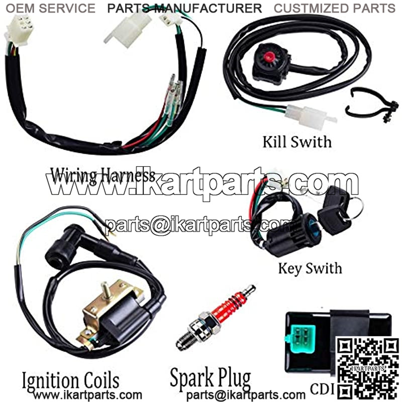 Pit Bike wire harness kit includes: Ignition Coil,CDI,Spark Plug, Key Switch,Kill Switch,Wire Harness.2-Wire Ignition Coil fits for most Chinese 4-stroke 50cc-125cc ATVs, Dirt Bikes, Go Karts, and also fit Honda XR50/CRF50 or it clones 70-125cc Pit Bikes.