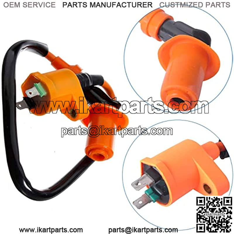 High Performance Racing Ignition Coil for Gy6 50cc 125cc 150cc Scooter ATVs Go Karts.Fits GY6 139QMB 152QMI 157QMJ 4-stroke engines.This Ignition Coil fits most of the Chinese Brands such as TaoTao, Buyang, Sunl, Roketa, Lifan, Aim-EX, Kazuma, Coolsports etc.