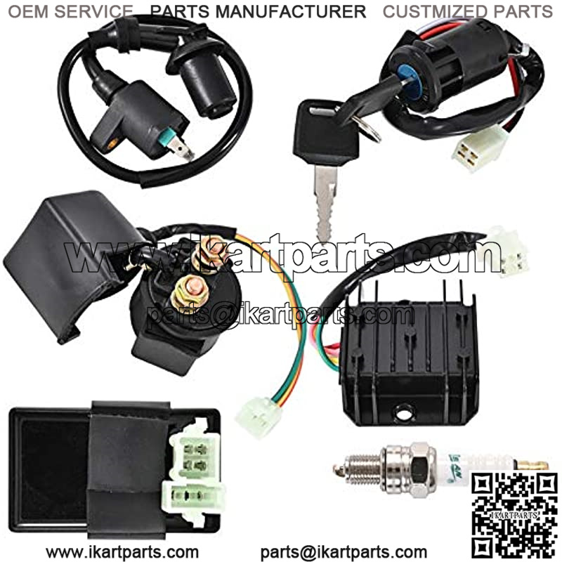 Package Including: Wiring harness, CDI, spark plug, ignition coil, solenoid relay, rectifier, ignition switch, ATV switch and magneto stator.