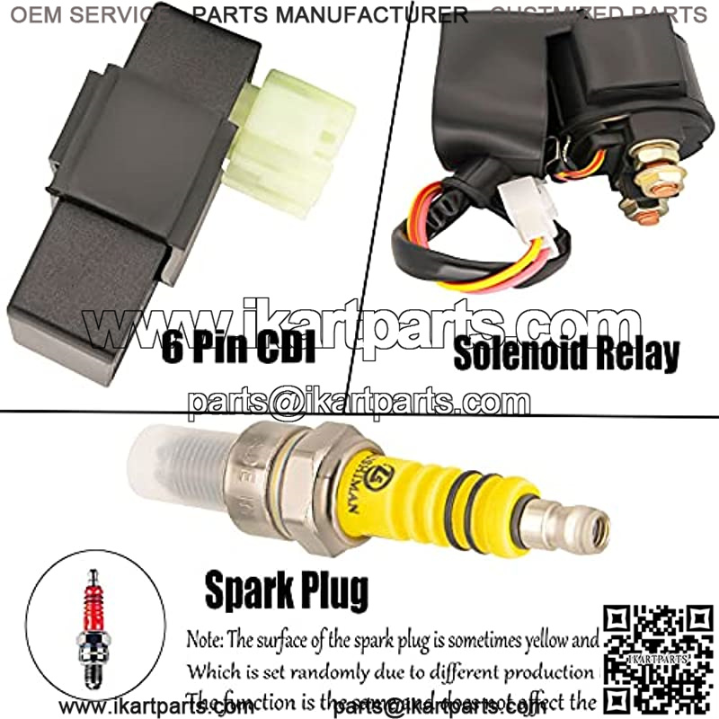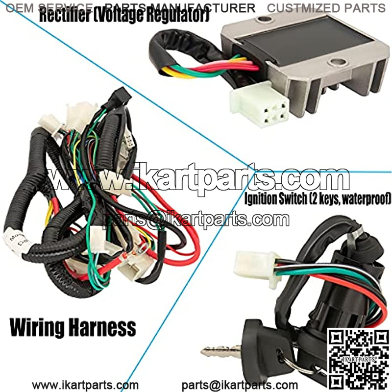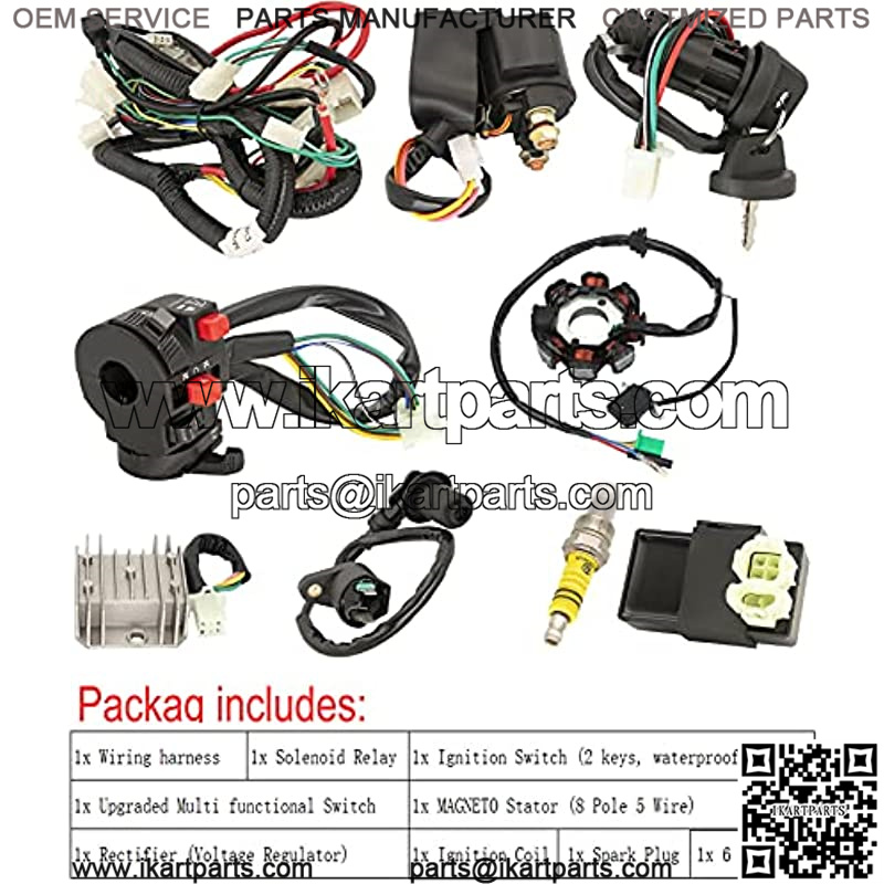 Packag includes: 1x GY6 125cc 150cc Wiring harness; 1x CDI; 1x Spark Plug; 1x Ignition Coil; 1x Solenoid Relay; 1x Rectifier (Voltage Regulator); 1x Ignition Switch (2 keys, waterproof); 1x Upgraded Multi functional ATV Switch; 1x Magneto Stator (8 Pole 5 Wire, 2 fixing holes).