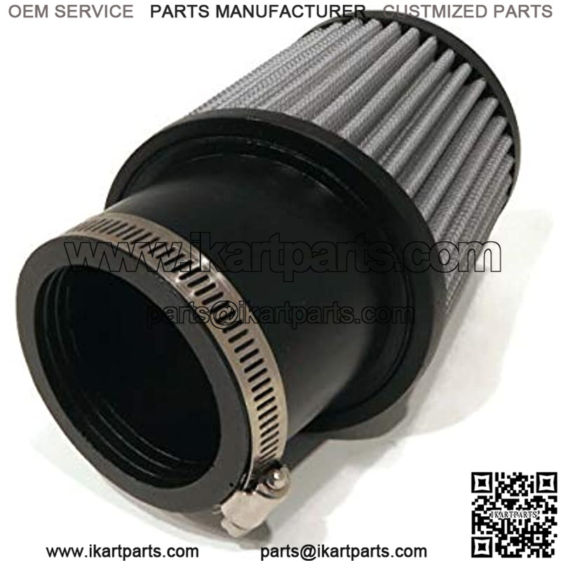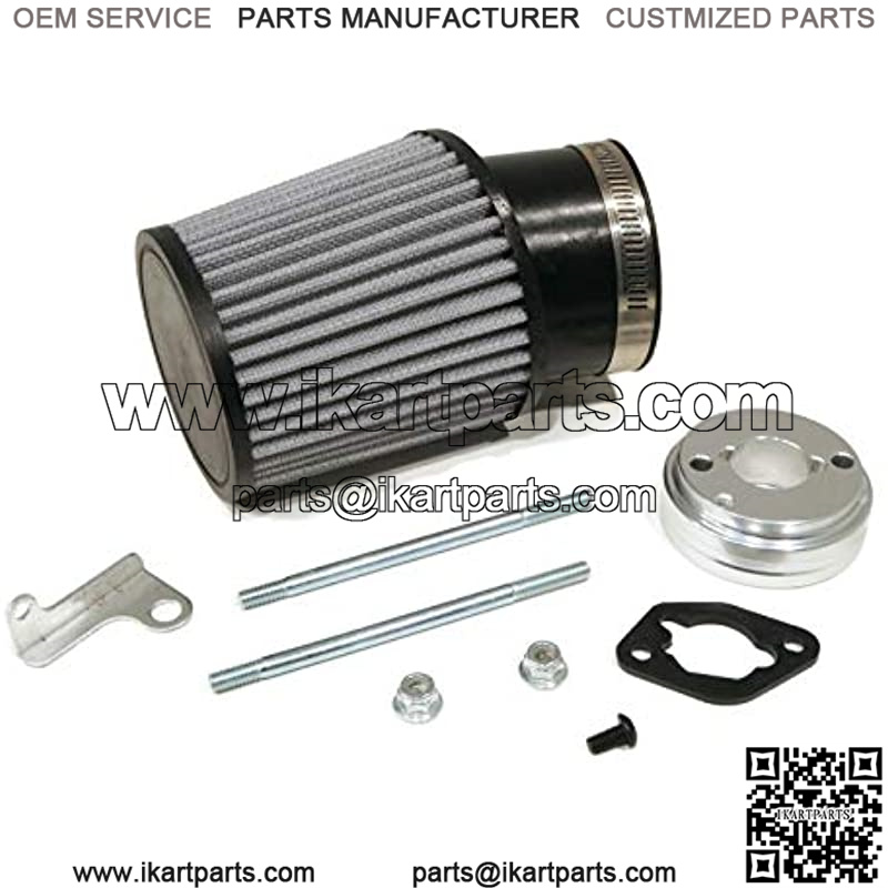 Includes – (1) Inlet Air Filter, (2) Filter-to-Carburetor Mounting Studs, (1) Aluminum Adapter, (1) Choke Hold Bracket, (1) Hose Clamp & Hardware; comes as shown in the first image