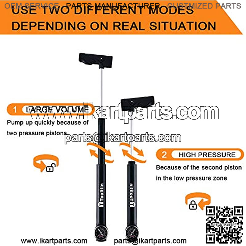 ??Two inflation modes,Reduce Pumping Time??- Oversized air cylinder enables Toolitin bike hand pump to reduce 30% inflating time compared to conventional mini bike pumps. This hand pump has 2 inflation modes that can be switched freely, the pumping speed of the low pressure mode is doubled, and the pumping of the high pressure mode is more accurate.