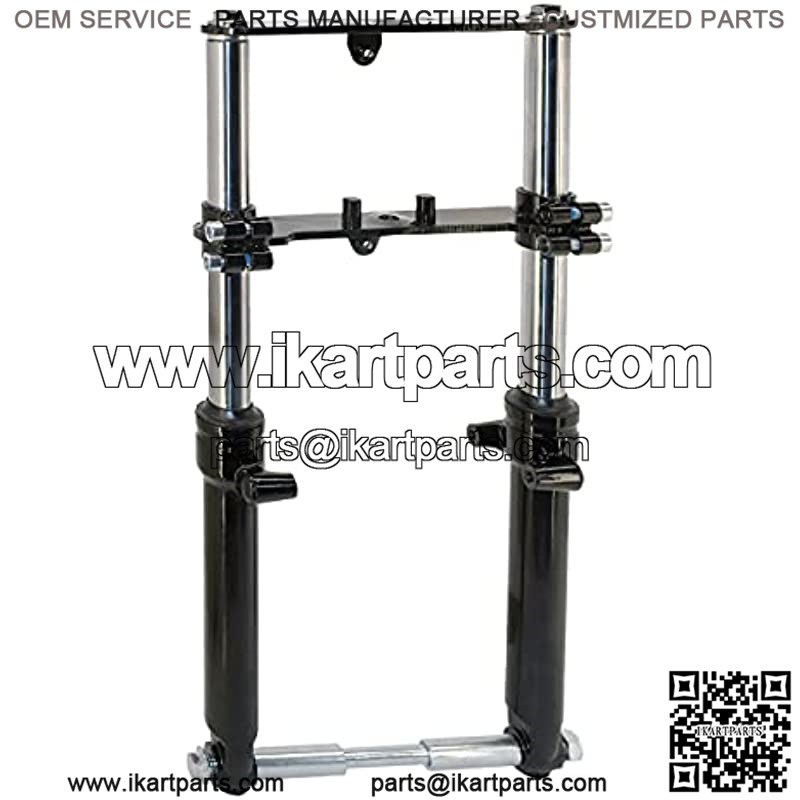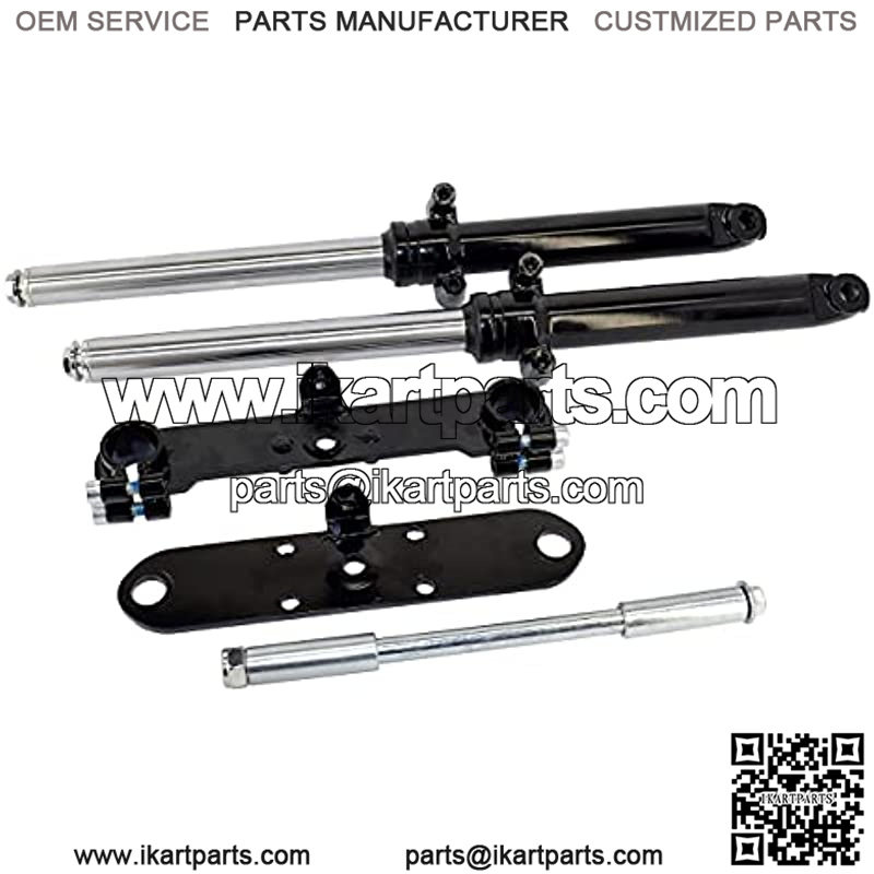 rubber seals ensure a long life of this telescopic front end. With its fully adjustable lower fork clamp, this front end can be mounted onto virtually any mini bike with a similar length set of forks. If your mini bike has a 5/8″ kingpin or axle then simply enlarge the kingpin/axle holes with a 5/8″ drill bit. Direct Bolt On Applications Monster/ Mega Moto 80cc / 105cc Motovox 80cc / 105cc All Doodlebugs/Small Bajas (originally equipped with a 4hp or smaller engine) This hydraulic front end can be modified to fit virtually any old school mini bike with similar length forks. Will not fit Coleman 200 series bikes. Included with this kit: Two telescoping forks Upper fork plate with bolts Lower fork clamp with pinch bolts 12mm axle bolt 12mm axle nut Axle spacers Dimension: Length (top plate to center of axle) – 19″ Inner fork clearance (distance between the two forks) – 6.875″ Forks hold 3 oz. of FORK OIL.