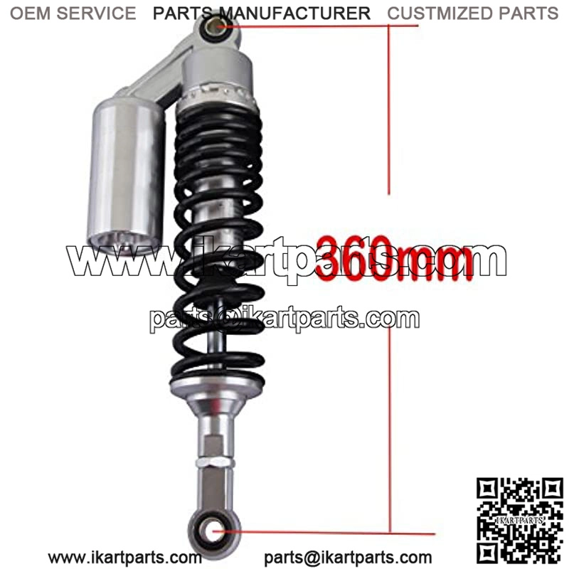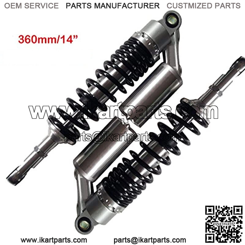 Motorcycle shock absorber universal fit for most vehicles, like Honda/Yamaha/Suzuki/Kawasaki, etc. The diameter of the round hole at the bottom is 12mm. Fit bikes with shock absorbers of 360mm eye to eye distance.Shock strength adjustable. Best choice for replacement, style upgrading or bike modification.Please check the size details and make sure it will fit your bike before purchase.The coil-over springs and air cylinder are helpful to reduce the shock.Package included: One Pair Shock Absorber, 2 X Wrench, 2 X 12mm Tubes[10mm or 14mm tube bushes ,Clevis Ends(U-Types or Round Eyes) are also available in our store.]Color:360 Sliver and BlackItem: 360mm Motorcycle Shock Absorber One PairColor: As the pictures showsInstallation Type: Eye to EyeDistance from eye to eye: 360mm (14″)Working strobe: 68mmSpring Thickness: approx. 8mmMaximum load: 300 kg (??660 lbs)Top and bottom hole diameter:12mmMaterial: Aluminium and solid steelPlacement on Vehicle: Rear,Left,RightEye Diameter(with bushing