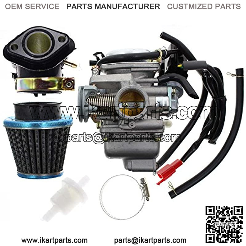 Package list: 1x Carburetor, 1x Intake manifold, 1x Air filter, 1x Fuel filter