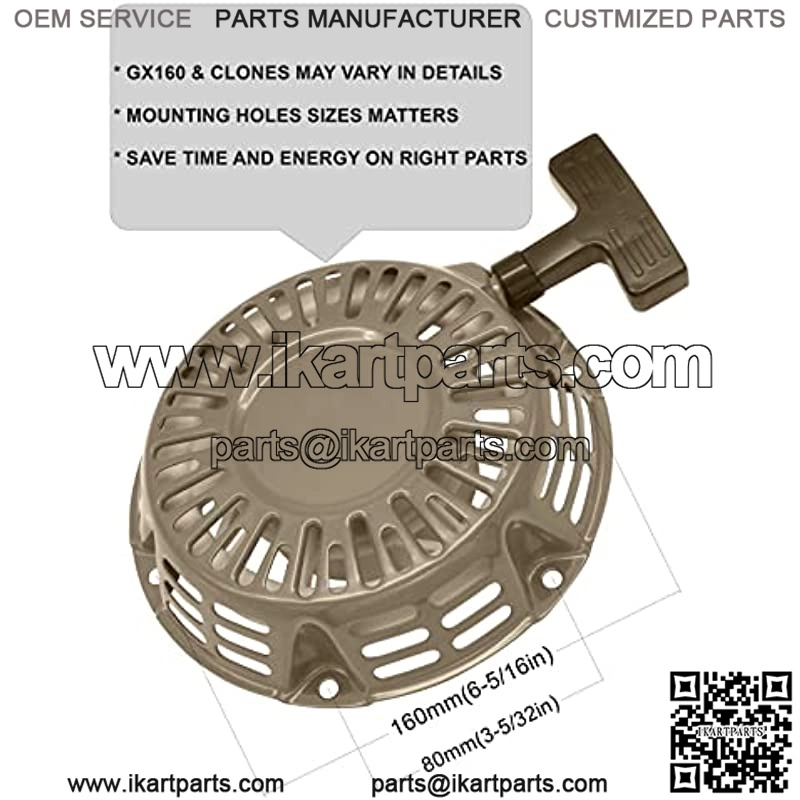 The recoil pull starter assembly, is black color, iron plate pawl, and it comes with an OEM nylon 66 pull rope, compatible with Honda pull cord, in 4.0mm diameter. The diameter of the rachet and the plastic housing is 54mm/75mm. Center to cente of bolt hole is 139mm( triangle pattern), 160mm(hole to hole center through starter centre point). Comes with 1 recoil pull starter, 1 pull rope, in bubble bag and plastic bag packing, brand new. Please check the pawl and rachet type, nut hole positions and product sizes with your orginal ones before ordering because Honda Clones may vary in details. Fits Predator 212 CT200U Champion and many Honda clones etc., replacement part for lawn mowers, edge cutters, snow blowers, pressure washers, water pumps, ATV, mini bike, tillers, go kart etc. Fits many generator models of Honda clones Predator Firman Blackmax ETQ Champion 3000 3500 4000 4500 powered by 159cc 163cc 196cc 212cc 224cc etc.