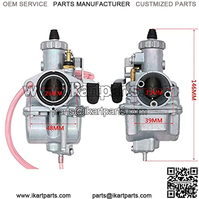 Engine side:Manifold Outlet Diameter: 26mm (22mm inner),Manifold Bolt Eye-Eye: 48mm,Manifold Bolt Diameter: 6.5mm,Air Filter Outlet Diameter: 38mm