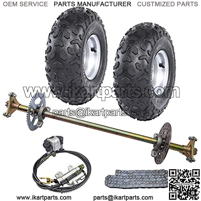 Package includes: (1) Axle Assembly, (2) Wheels (with tire, rim), (1) T8F Chian, (1) Brake Master Cylinder Caliper Assembly, (1) Sprocket, (1) Brake Disc, (2) Pillow Block