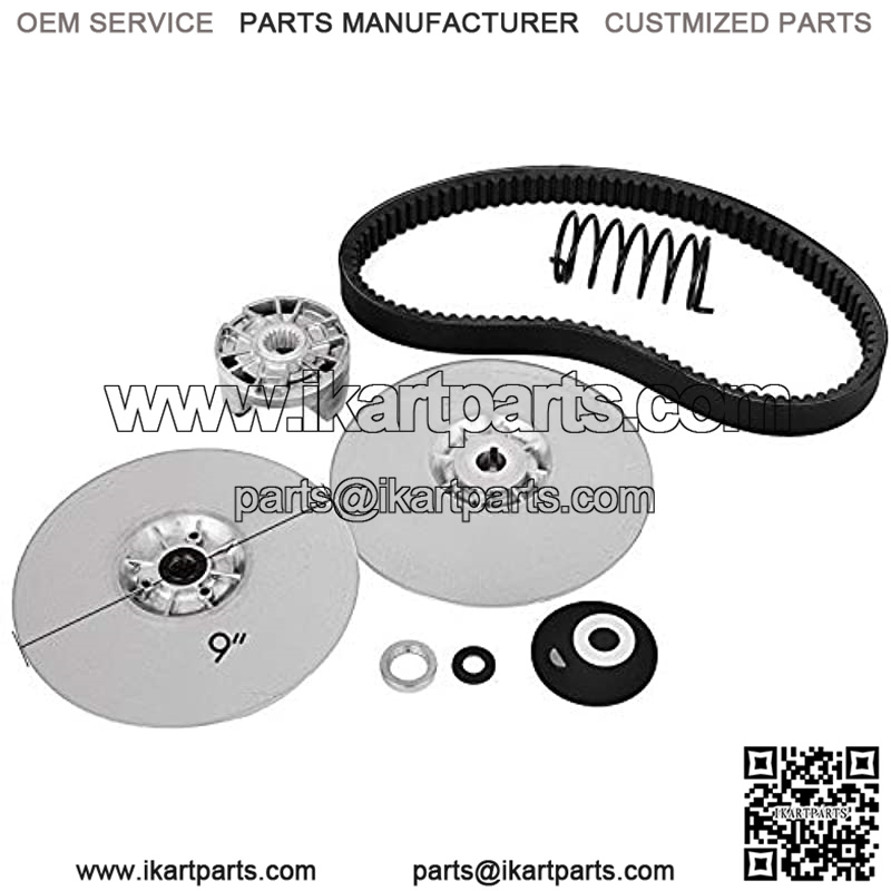Full Equipment The clutch is a power clutch kit containing the fixed sheave, sliding sheave, spring, spring seat, ramp shoes, woodruff key, nut, spacer, washers and cotter pin, and a new drive belt.