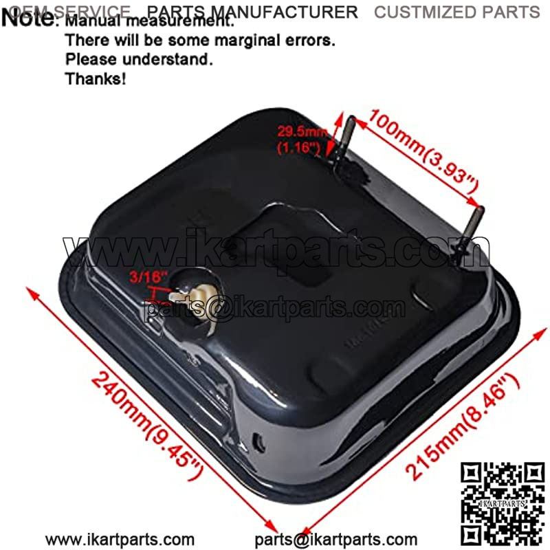 Painted with Anti-corrosion spray paint Outside, Pickling & Phosphating Inside the fuel tank; Ensure Long Service life From Contamination & Fuel corrosion.