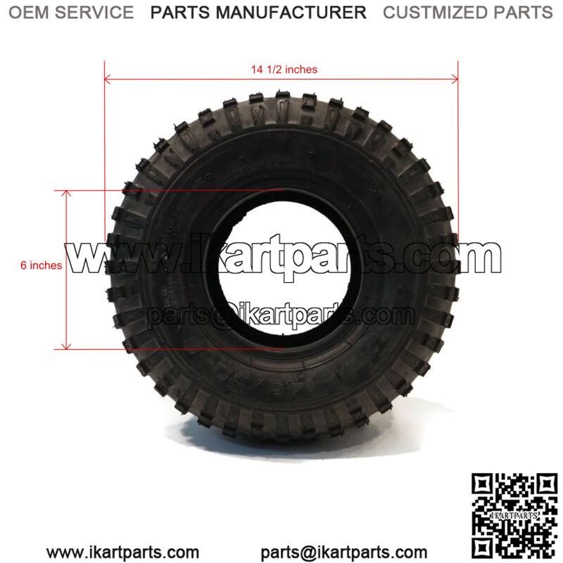 Specs – Tire Size: 145x70x6, Rim Size: 6×4.5, Overall Diameter: 14.4″, Section Width: 5.4″, Section Width: 5.4″, Tire Pressure: 4 PSI, Max Load: 75 lbs, Type: Tubeless, Tread: Knobby, Ply: 2 Ply. Refer to images 2 & 3 for more information