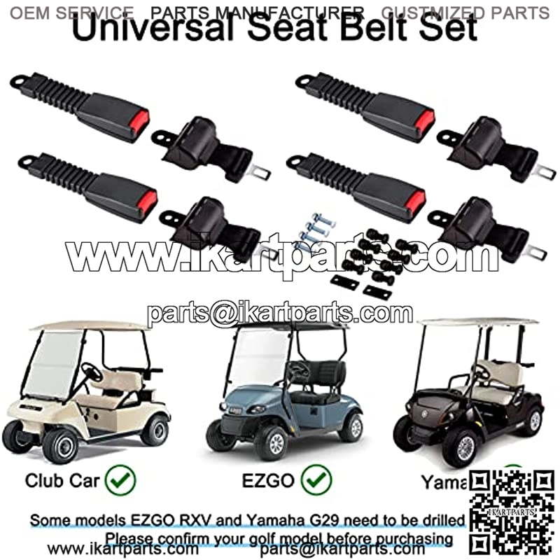 [Widely Compatible]: Universal Golf Cart Retractable Belts Kit Designed to Work on Front Rear Lap Belt.[4 Pack in set]: 4 Pack 42″ beltsRetractable belts kit fits EZGO TXT&RXV Yamaha Drive Club Car DS& Precedent. 2 Point, Auto retractable. Size: 42*2 inch.[Easy to install]: 4 retractable Belts and all necessary installation hardware, you don??t need to drill holes, everything attached very easily.Retractable belt kit works great and keeps the kiddos nice and safe[Keep Your Safe]: Our golf cart seat belts have passed American DOT certification.Belts Bracket Kit make your golf cart legal for street use in your city. passengers like the extra safety and stability??Especially in the back.[ Customer Service]: Any questions, please email us, we will got a reply within 24 hours. We always stand behind and assist you.Golf Cart Accessories ,About us Golf Cart 4PCS 42″ Universal Golf Cart Retractable Seat Belts Front Rear Lap Seat Belts Kit for Golf Cart EZGO Yamaha Club Car, easy to Install, dura