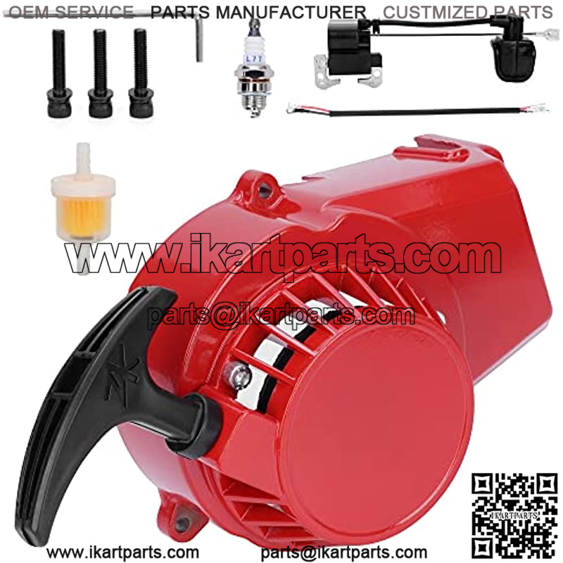 Upgraded Aluminum Alloy Pull Starter, Recoil Starter Assembly Ignition Coil for 2 Stroke Engine 47cc 49cc 50cc SYX SSR Taotao Coolster Quad 4 Wheeler Mini Pit Bike Go Cart ATV Scooter FitmentFor 2 Stroke Engine 47cc 49cc Chinese ATV Quad 4 Wheeler Go kart Pit Dirt Mini Pocket Chopper Bike Motor Gas Scooterfor 47cc49cc SSR, YCF, IMR, Atomik, Thumpstar, BSE, Kayo, Stomp, Piranha, DHZ, GPX,Pitster Pro, SDG, Braaap, Taotao, Coolster, Roketa, and many other Chinese brands. ReplacementCoolster 49cc Dirt BikeSSR SX50 Mini Dirt BikeMoto TecCali 40cc Pocket BikeX-TremeXP-489Syx Moto 49cc,does not work on SYX MOTO 50ccScrambler 49cc Pit Bike Specification:Product Name: Pull StartCondition:Brand NewMaterial:Aluminum AlloyColor:Red/Silver/Black Size:Mounting holes pacing -3.15?? (80mm)Length of the pull start-7.24??(184mm),Inner cog diameter-2.91??(74mm) Package Contents:1 x Pull Start3 x Bolt1 x Spark Plug1 x Wrench1 x Ignition Coil1 x Fuel Filter Note:-We provide clear pictures, measurements where possible. Please check as much aspossible to make sure the item is the one that you need.-All dimensions are measured by hand, Please allow 0.5-1 inch difference due tomanual measurement.(1inch=2.54cm).