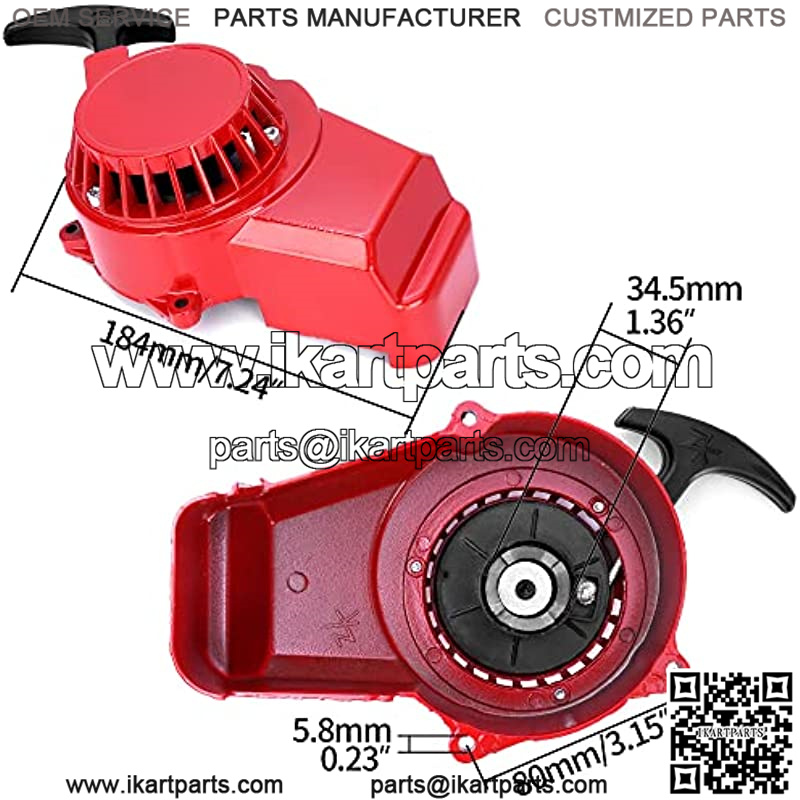 ??Specification??The size of 2 stroke pull start assembly : Mounting hole spacing -3.15?? (80mm), Length of the pull start-7.24??(184mm), Inner cog diameter-2.91??(74mm). Confirm your metal pull starter kit measurement before placing your order. Slight discrepancies may occur due to manual measurement