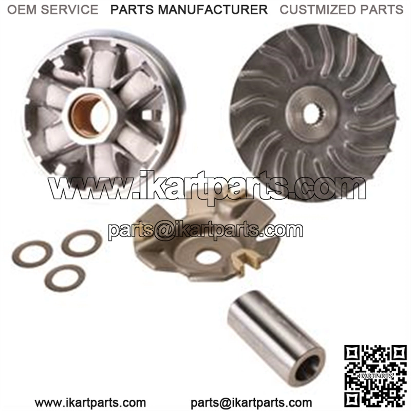 Dr. Pulley Variator Kit for 125cc – 150cc GY6 Scooters, ATVs, and Go KartsSPECIFICATIONS: Includes SlidersDoes Not Included Roller WeightsNumber of Splines: 19Drive Face Outer Diameter (A): 114mmBoss Inner Diameter (C): 15mmBoss Outer Diameter (B): 24mmRamp Plate Inner Diameter (D): 15mm Fan Inner Diameter Peak to Peak (H): 14mmFan Inner Diameter Valley to Valley (G): 15mmThis performance Dr. Pulley Variator (front clutch assembly) is specifically made for the GY6 150cc engine. Therefore, this clutch only works for the GT 250 or Standard 250 or any other 250s on the market that are Forward/Neutral/Reverse OR Forward/Reverse.Specially coated ramp plates create less friction on the rollers or sliders, allowing them to adapt more rapidly to changing driving conditions and resulting in less wear.The steep angle ramp plates in the Dr. Pulley variators allow for faster and smoother engagement at all speeds, and allow lighter weighted sliders to fully extend to make the most of your CVT syst
