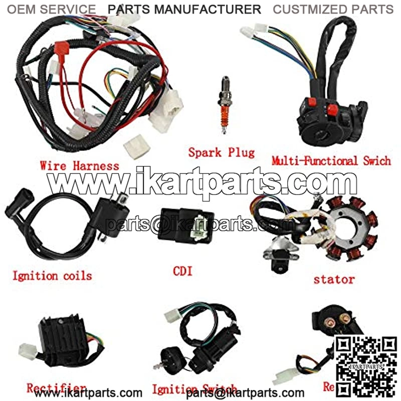 ??Package Content??: 1 x Wiring harness, 1 x CDI, 1 x Spark Plug, 1 x Ignition Coil With Lead, 1 x Solenoid Relay, 1 x Rectifier (Voltage Regulator), 1 x Ignition Switch (Waterproof), 1 x Multi-functional ATV Switch, 1 x Magneto Stator (8 Pole, 3 fixing holes).